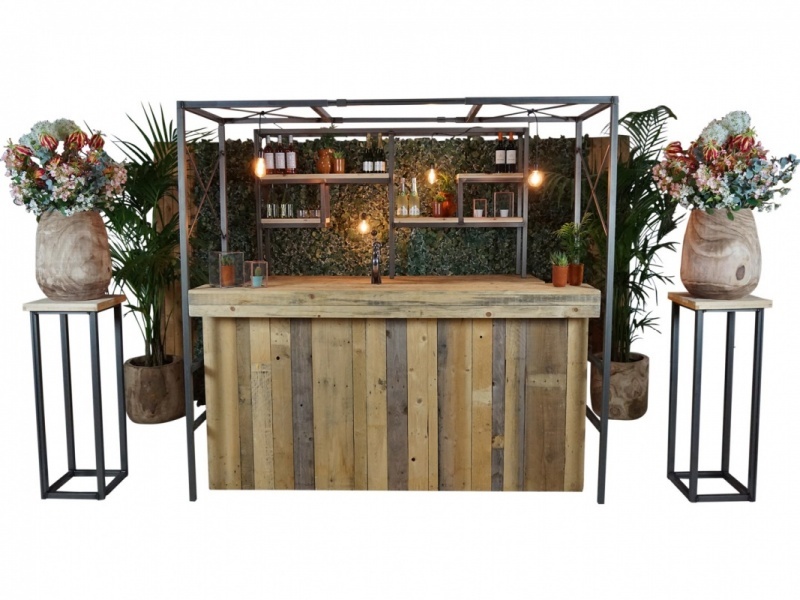 Deze luxe bar helemaal gestyled in het thema ”Industrial Green”. Deze bar wordt geleverd inclusief tap en Achterwand met verlichting 2 houten potten Bob 2 kentia planten Ombouw en klimop wand Om gewicht te besparen is dit product gemaakt van sloophout.