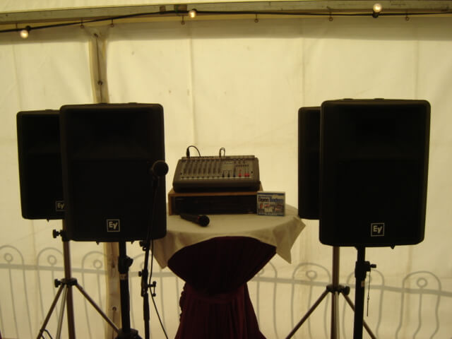 Complete geluidsset met 4 speakers en mengpaneel, microfoon en aansluitingen voor telefoon en laptop.