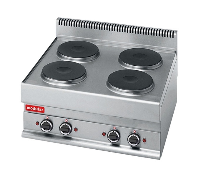Modulair kookplaat 4-pits 400V, voorzien van zwaar gegoten EGO kookplaten Ø 220 mm met roestvrijstalen rand.