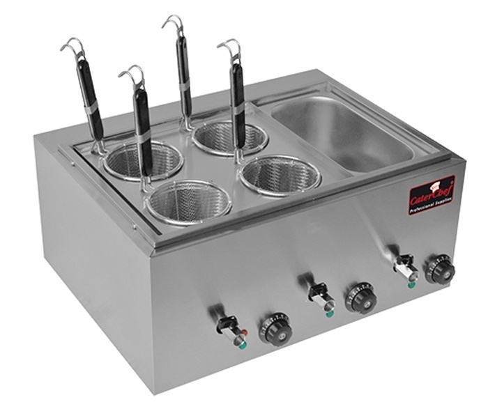 Ons pastakookapparaat heeft 4 ronde mandjes om pasta in te koken en daarnaast een 1/3GN bak om bijvoorbeeld saus warm te houden.