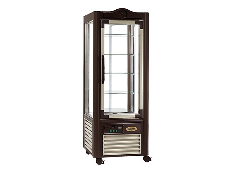 Deze vitrine heeft 5 draaiplateau’s, de diameter van de plateau’s is 50cm. Daarnaast is deze gebaksvitrine verrijdbaar.