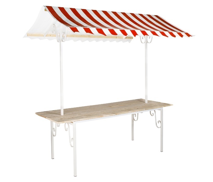 Franse partykraam met rood/wit gestreept doek. Afmetingen blad: 205x80cm Afmetingen dak: 205x135cm De afstand tussen de staanders is 160cm.