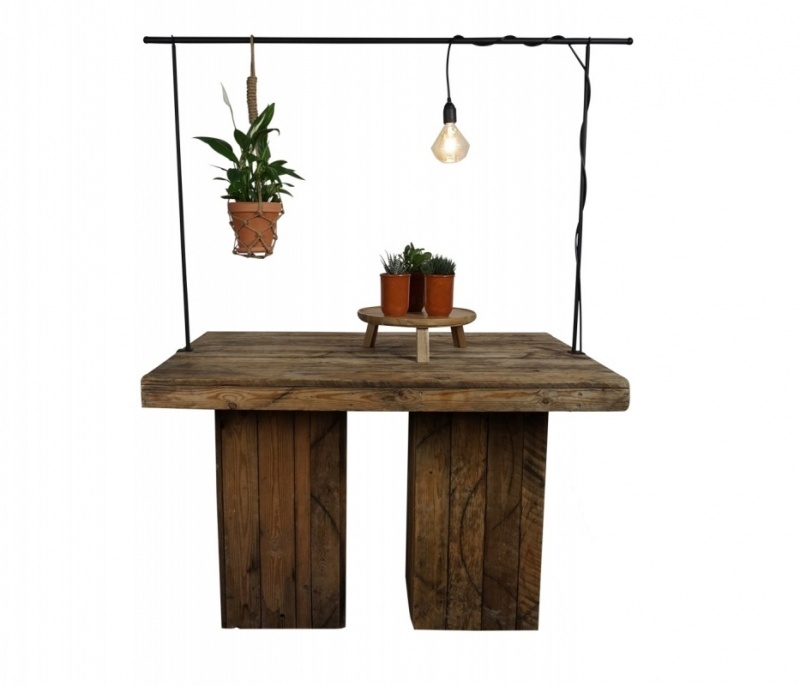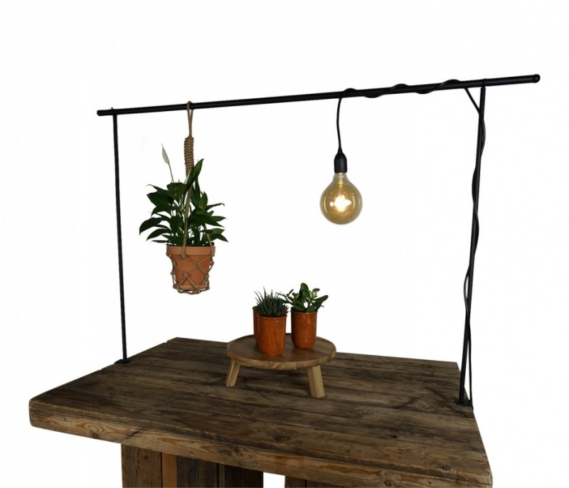 Onze Urban Jungle statafel 120x80cm komt compleet met hangplant, lamp en een plateau met potplantjes.