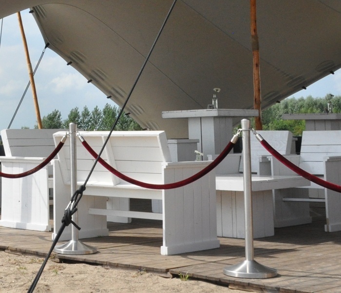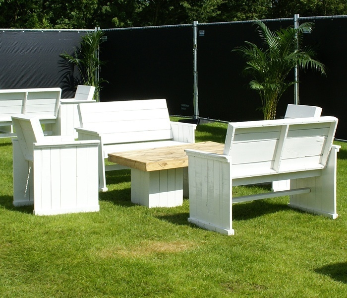 Deze set steigerhout deluxe bestaat uit 2 fauteuils, 2 banken met rugleuning, salontafel en kussens. De kussens zijn verkrijgbaar in verschillende kleuren, zodat de inrichting naar uw smaak gedecoreerd kan worden. Om gewicht te besparen is dit product gemaakt van sloophout.