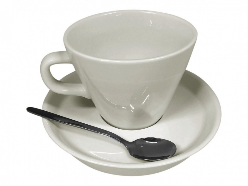 Dit koffieservies bestaat uit een kopje, schoteltje en lepeltje.